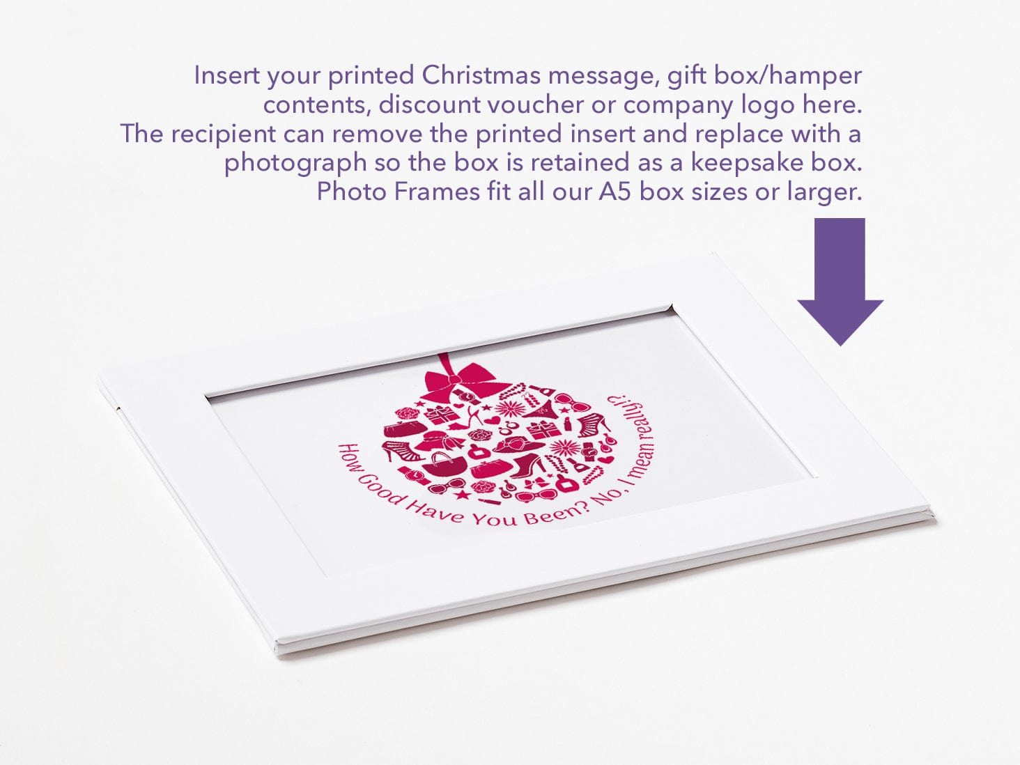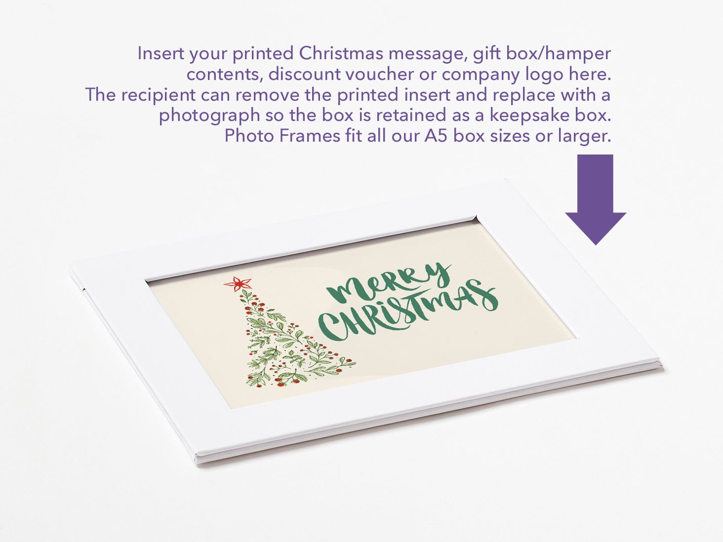 Our White Photo Frames are a refined and versatile accessory designed to complement our folding gift boxes. They enable you to add a photograph, printed product information, company logo or promotional message to the inside or outside lid of the gift box with ease.
