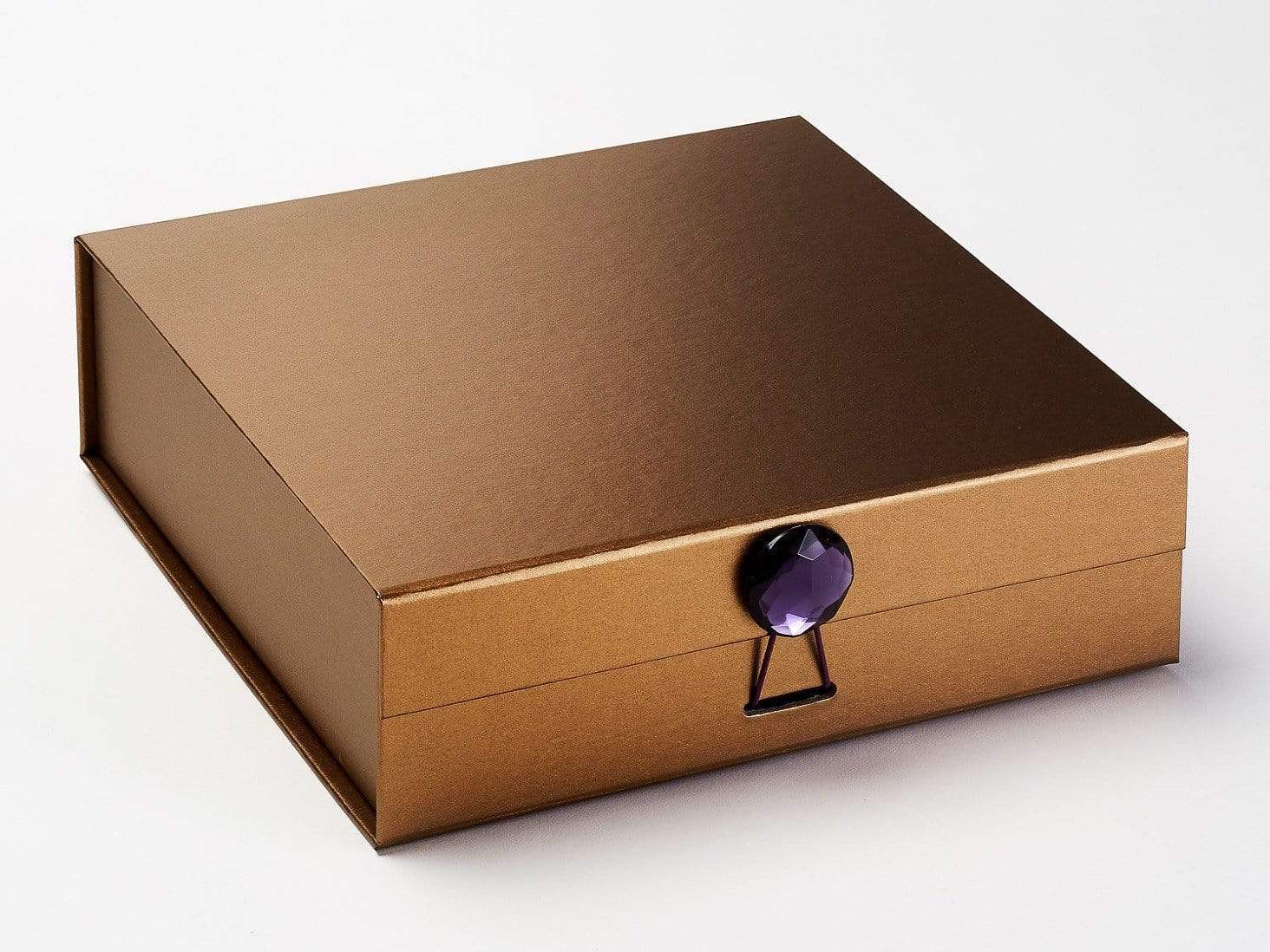 Amethyst (dark purple) decorative gemstone closures are pre-threaded with a matching purple elastic cord loop, adding a rich, jewel-toned finishing touch to your gift boxes.