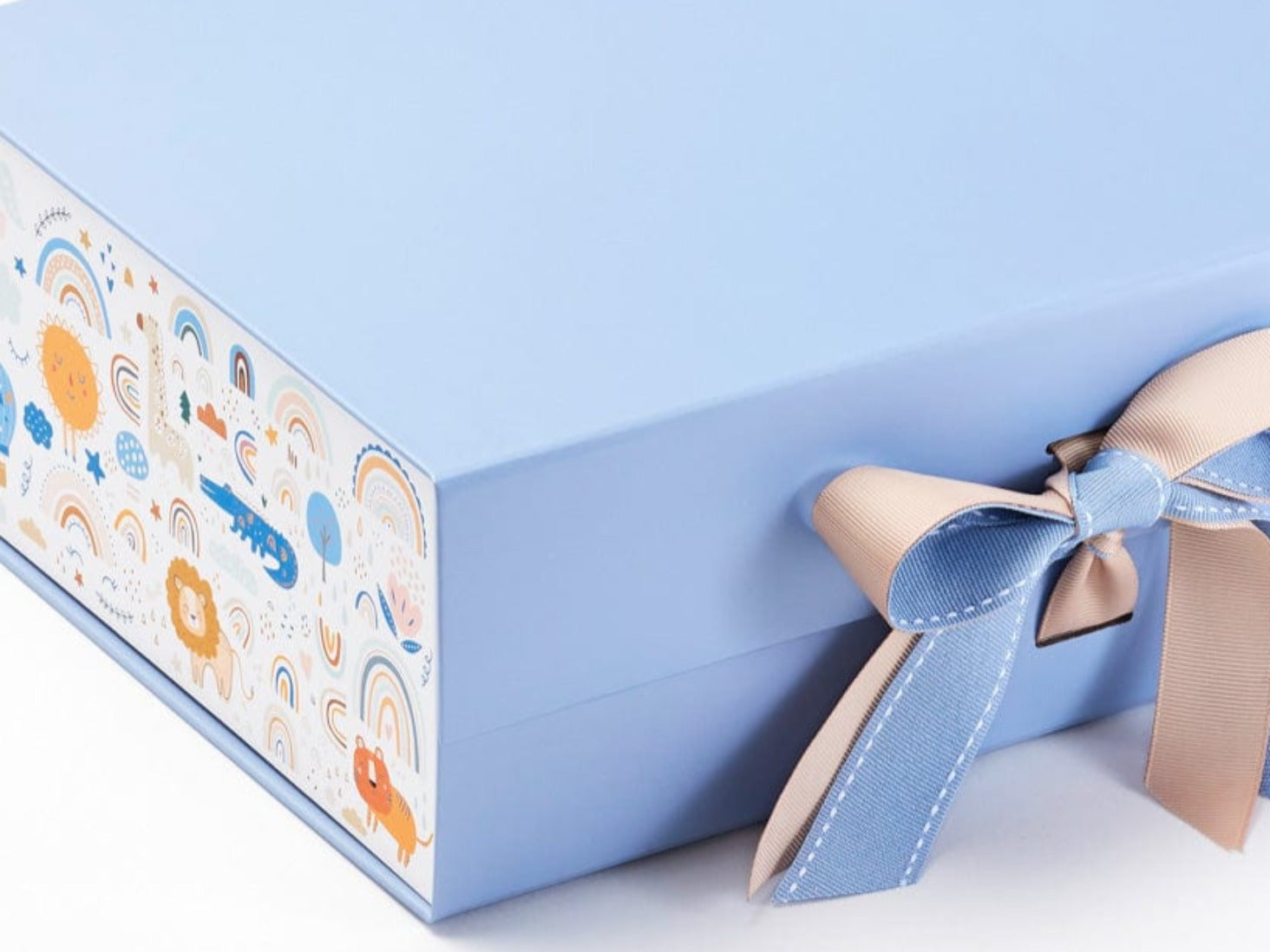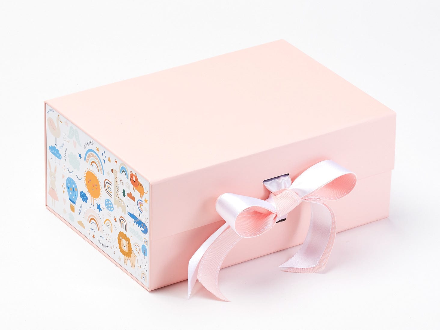 This cute and colourful unisex menagerie animal and rainbow design is perfect for baby keepsake boxes and baby product gifting.