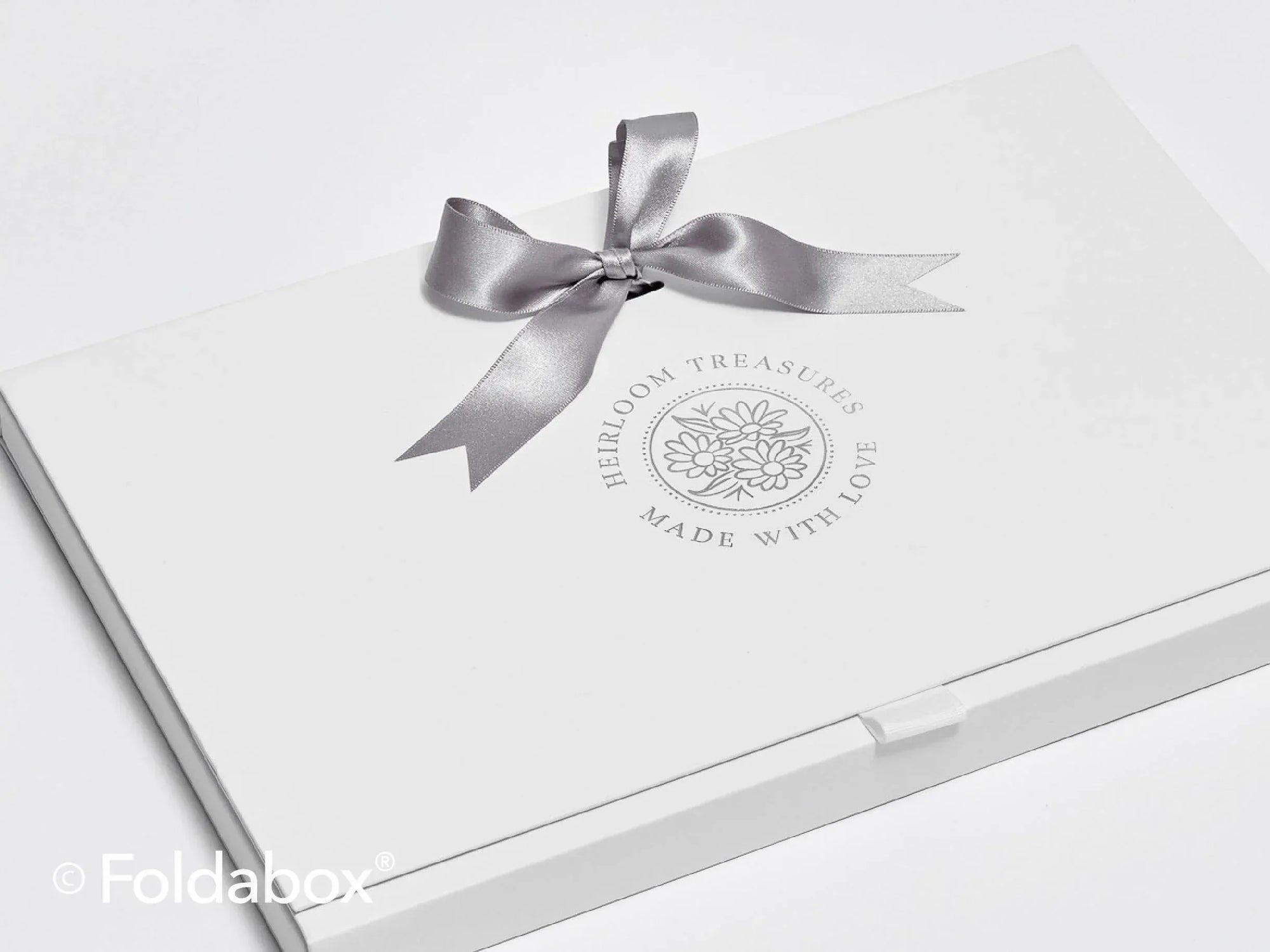 Each box comes with a length of white grosgrain ribbon threaded through discreet ribbon slots, making it easy to personalise with your brand colours or theme.