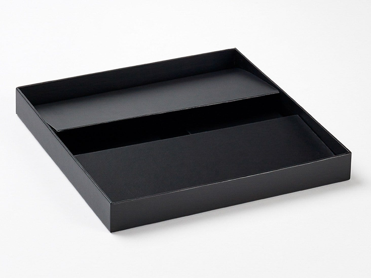 Crafted with a black matt laminated finish, these boxes provide a luxurious and sophisticated appearance. The base folds flat and assembles easily with four large sticky corners, allowing for quick setup. When not in use, the folded base neatly sits within the 3cm depth of the rigid lid, saving up to four times less space compared to traditional rigid boxes.