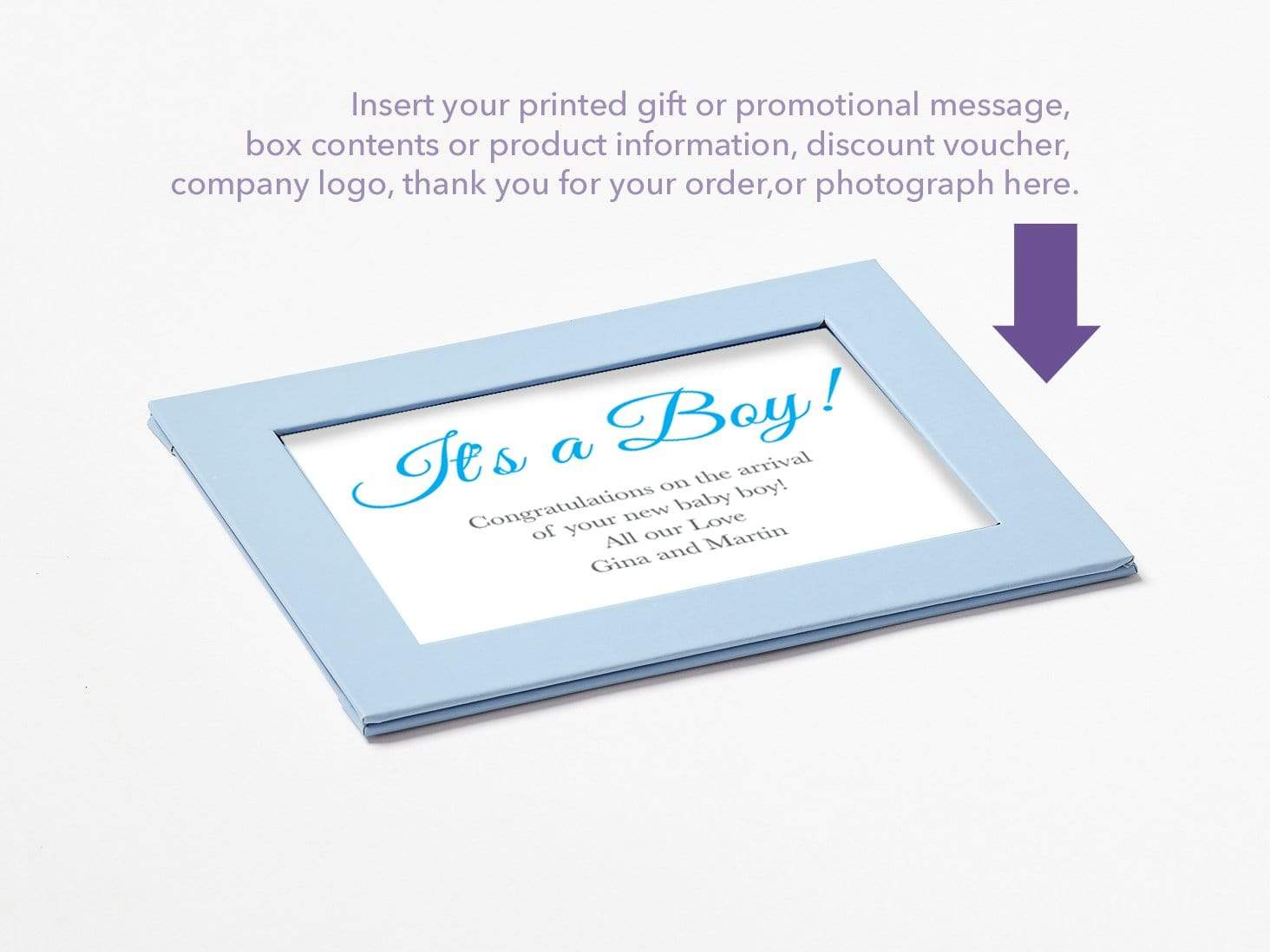 Pale Blue Photo Frames transform multiple gift box sizes into personalised keepsake packaging. Add your company details while allowing the recipient to personalise the box by inserting their own photograph, increasing brand retention and extending the life of your packaging.