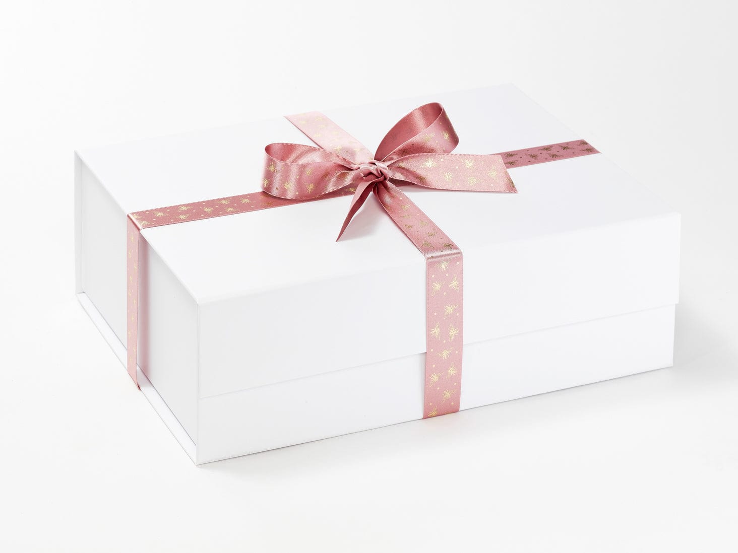 This rose pink satin ribbon features an on-trend gold foil bumble bee repeat design to one face, bringing a distinctive decorative element to luxury gift packaging. The smooth satin base and delicate metallic detailing create a refined balance of softness and visual interest, offering a high-end finishing touch that feels considered rather than overworked.