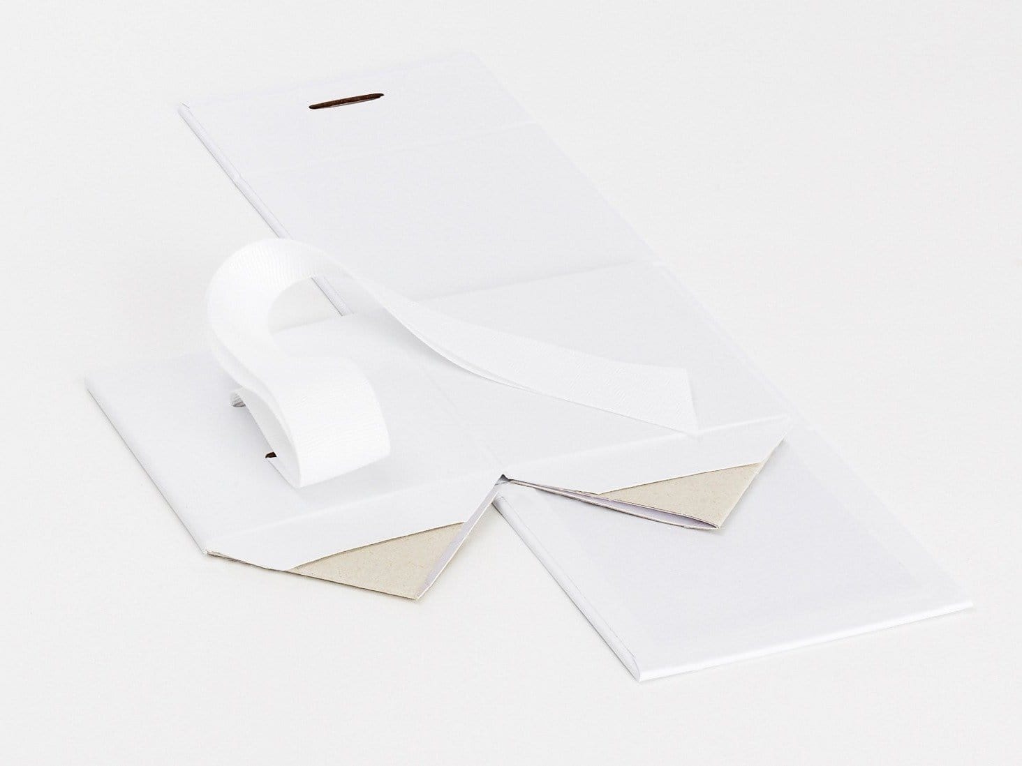 - 80cm length x 2.5cm width white polyester grosgrain ribbon pre-threaded through box body slot. Ribbon can easily be removed and replaced.