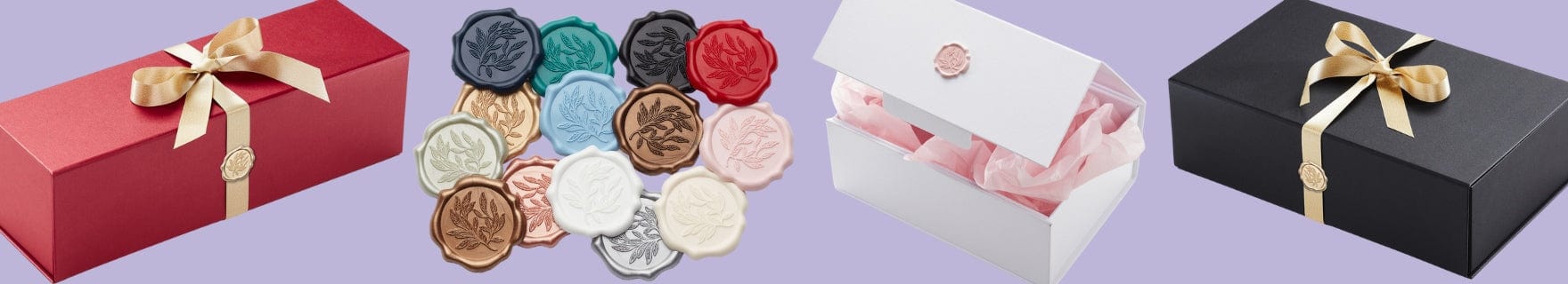 Use our wax seals to seal luxury tissue paper wrapping in matching or complementary colours, or to accentuate no-magnet gift boxes and bottle boxes. The seals are designed to cover box slots if you prefer not to use the supplied ribbon, making them both decorative and practical.