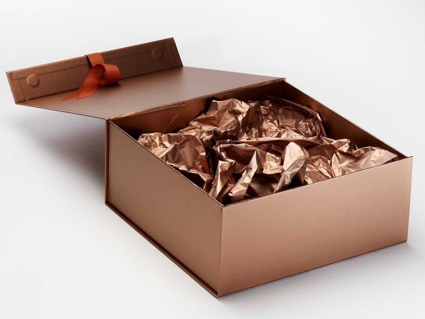 XL Deep Copper folding gift boxes with changeable ribbon are perfect luxury hamper gift boxes for larger products and retail packaging for specialty food hampers, on trend wedding keepsake boxes, clothing packaging or luxury product e-commerce of point of sale gift wrapping.
