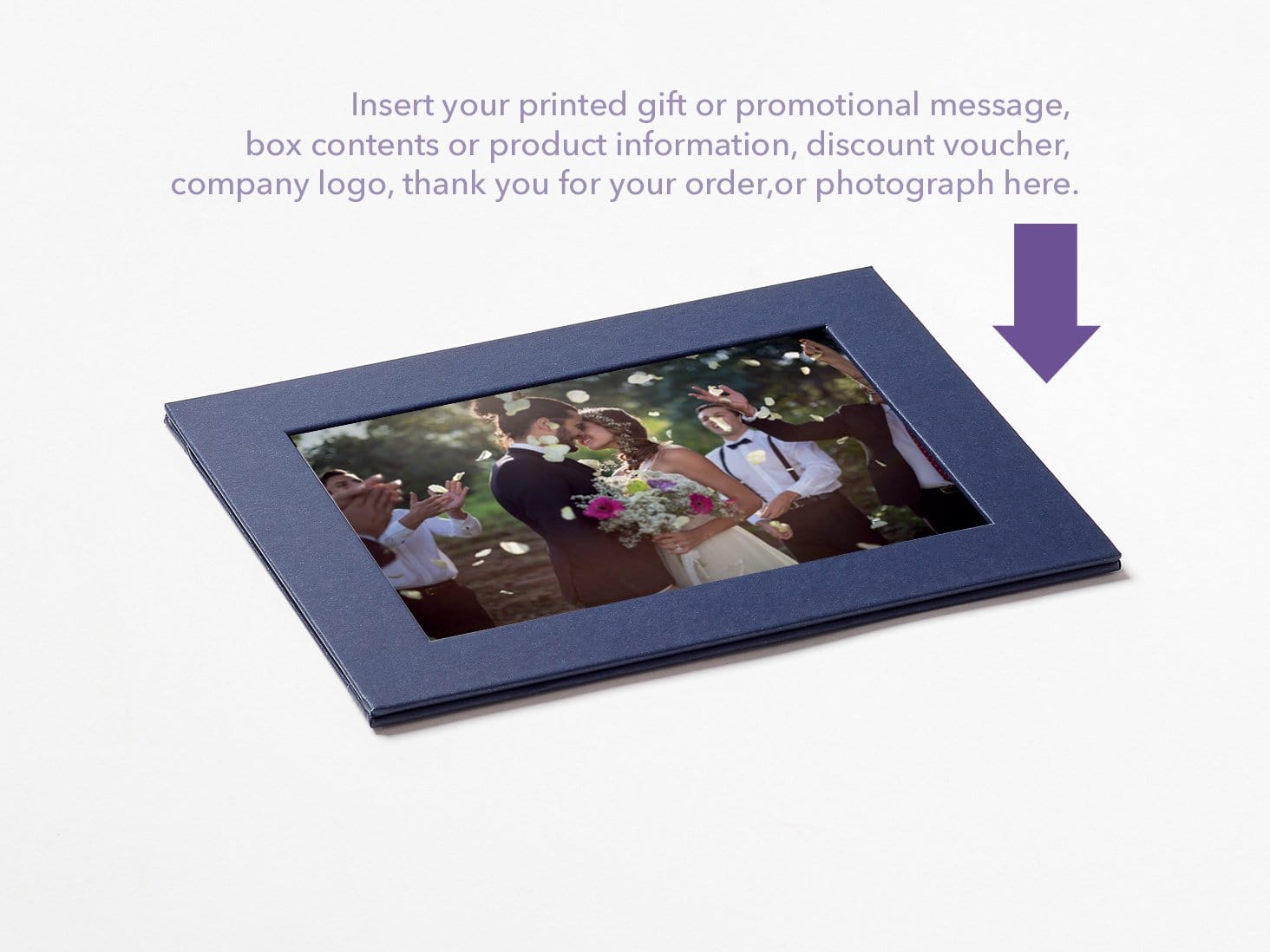 Navy Blue Photo Frames are a refined accessory designed to complement our folding gift boxes, enabling you to add a photograph, printed product information, company logo or promotional message to the inside or outside lid of the gift box.