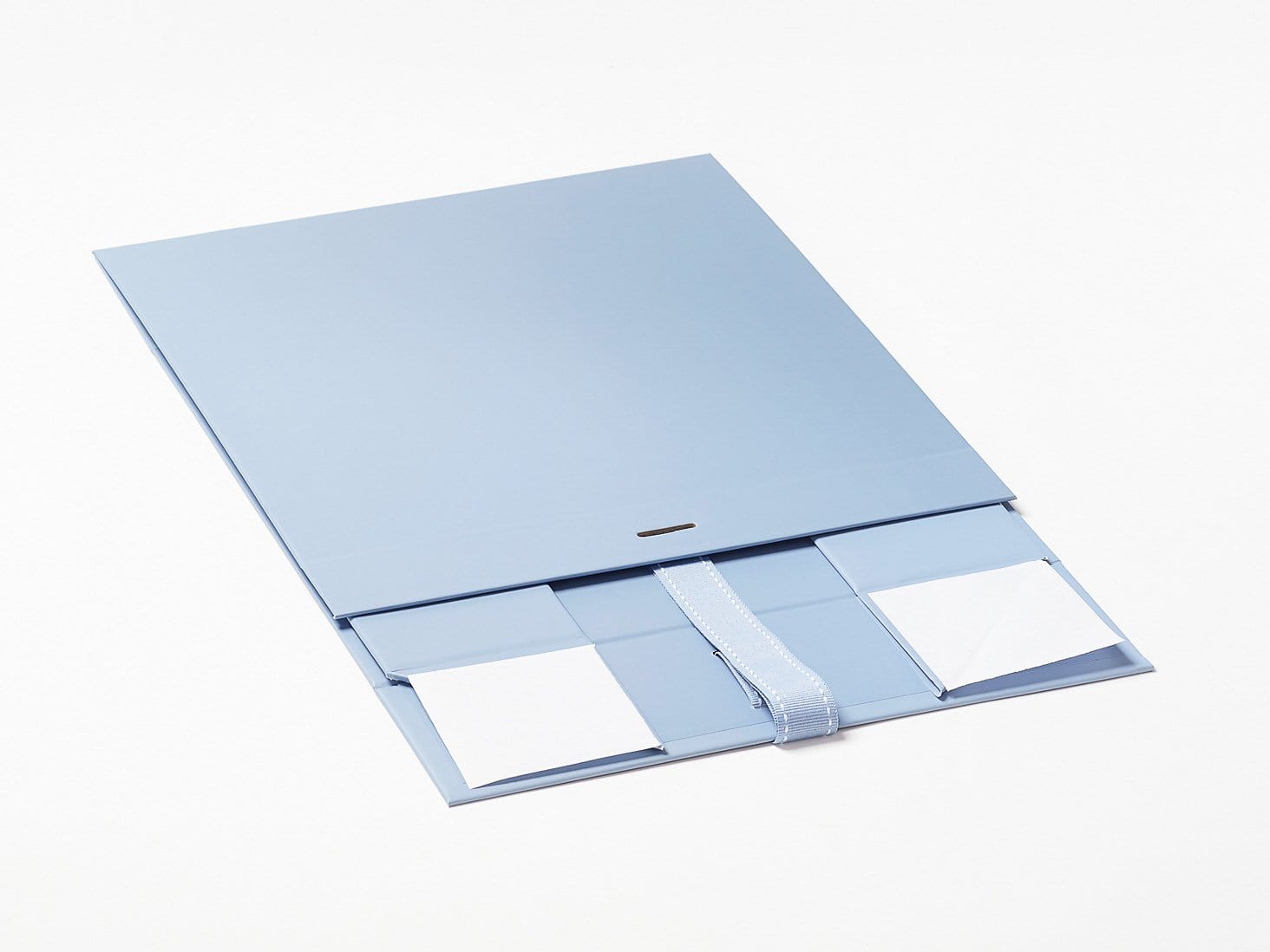 - 80cm length x 2.5cm width matching pale blue polyester grosgrain ribbon with white saddle-stitched edges pre-threaded through box body slot.