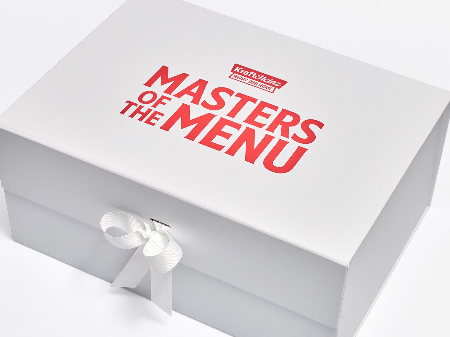 White A3 Deep gift boxes with changeable ribbon are ideal retail, e-commerce and display packaging for food and wine hampers, grazing boxes, tea and coffee hampers, beauty products, wigs, clothing, fashion accessories and soft furnishings.